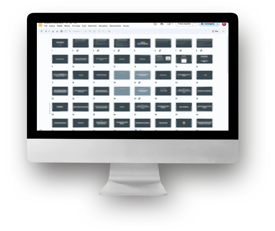 To gotowy do użycia, profesjonalnie zaprojektowany zestaw slajdów w Prezentacjach Google. Wystarczy, że wypełnisz je swoją wiedzą, a w 4 godziny Twój webinar będzie gotowy do nagrywania!