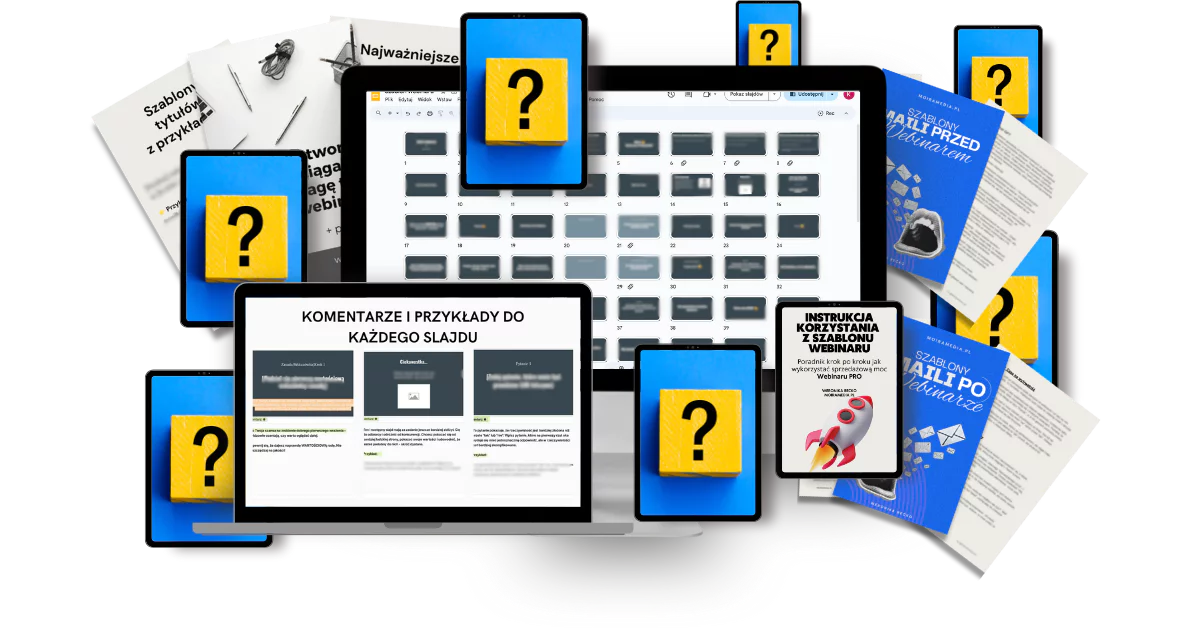 Otrzymujesz gotowy zestaw edytowalnych slajdów w Google Slides, które wystarczy wypełnić własną wiedzą. Znajdziesz tam sekcje na budowanie autorytetu, przedstawienie problemu i rozwiązania, prezentację kursu i oczywiście, skuteczne wezwanie do działania. Do tego dostajesz szczegółową instrukcję i mini-poradnik o tworzeniu chwytliwych tytułów webinarów. Wszystko, czego potrzebujesz, aby stworzyć idealny webinar sprzedażowy!